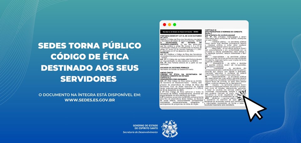A Secretaria de Estado de Desenvolvimento (SEDES) divulga a ratificação do Código de Ética dos Servidores vinculados a pasta por meio da Portaria Nº 127-R, de 24 de outubro de 2023, publicada, nesta quinta-feira (26), na edição do Diário Oficial do Estado. O documento está disponível no site www.sedes.es.gov.br.