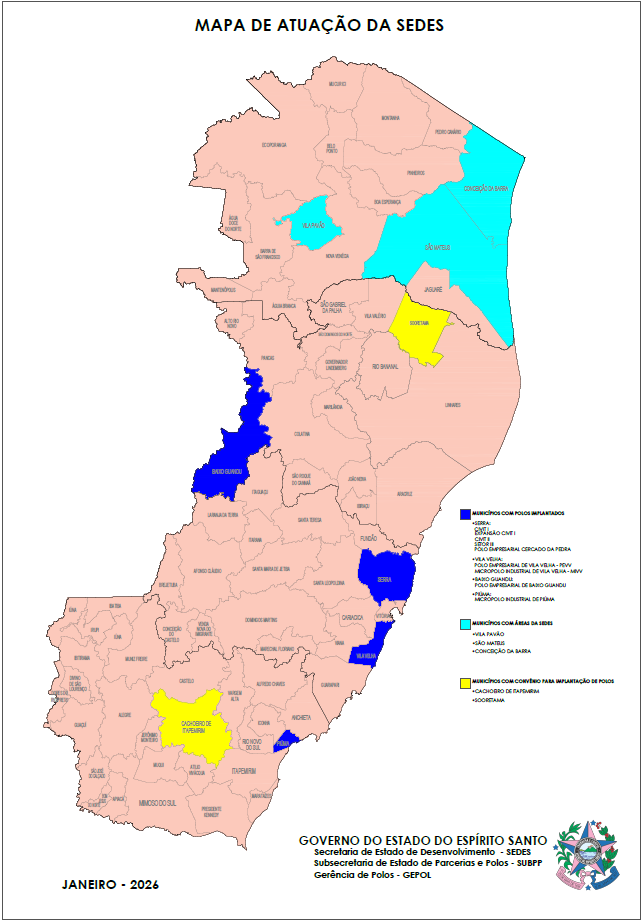 A gestão dos polos industriais e empresariais é atualmente disciplinada pelo Decreto nº 6.174-R, de 29 de agosto de 2025, que instituiu a Gerência de Polos, vinculada à Subsecretaria de Estado de Parcerias e Polos, no âmbito da SEDES assegurando: